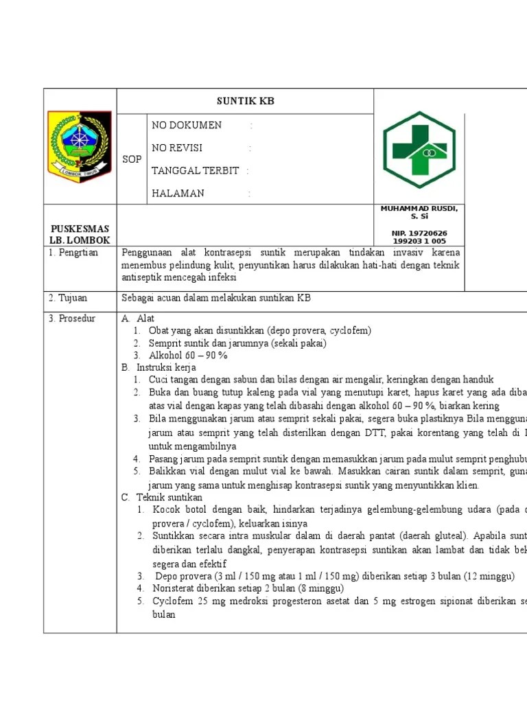 2 prosedur tetap tanggal terbit . Dinas pemberdayaan perempuan, perlindungan anak dan keluarga berencana. Download sop kb suntik 1 bulan free in pdf format. Create date june 17, 2021; Judul sop pelayanan suntik kb 3 bulan puskesmas segiri no.